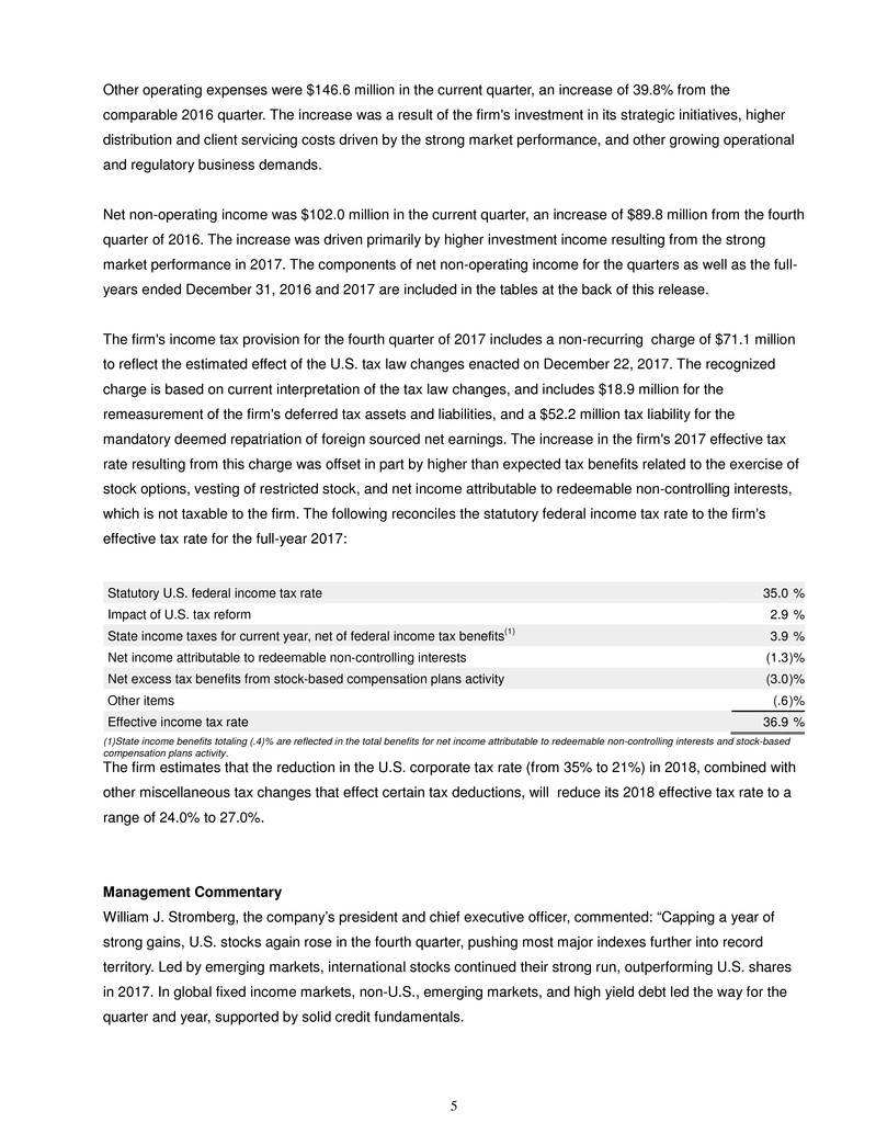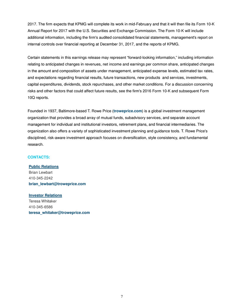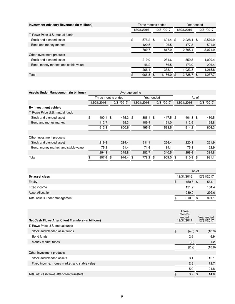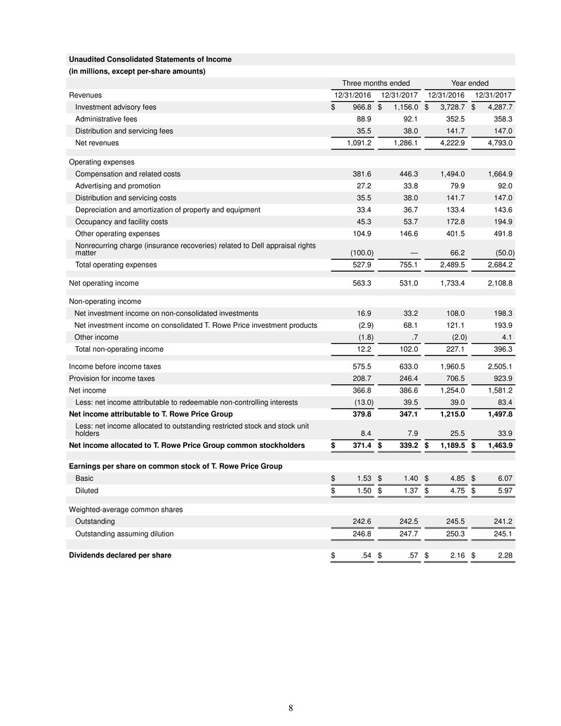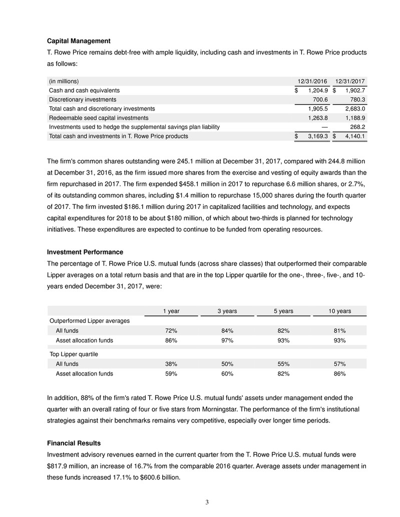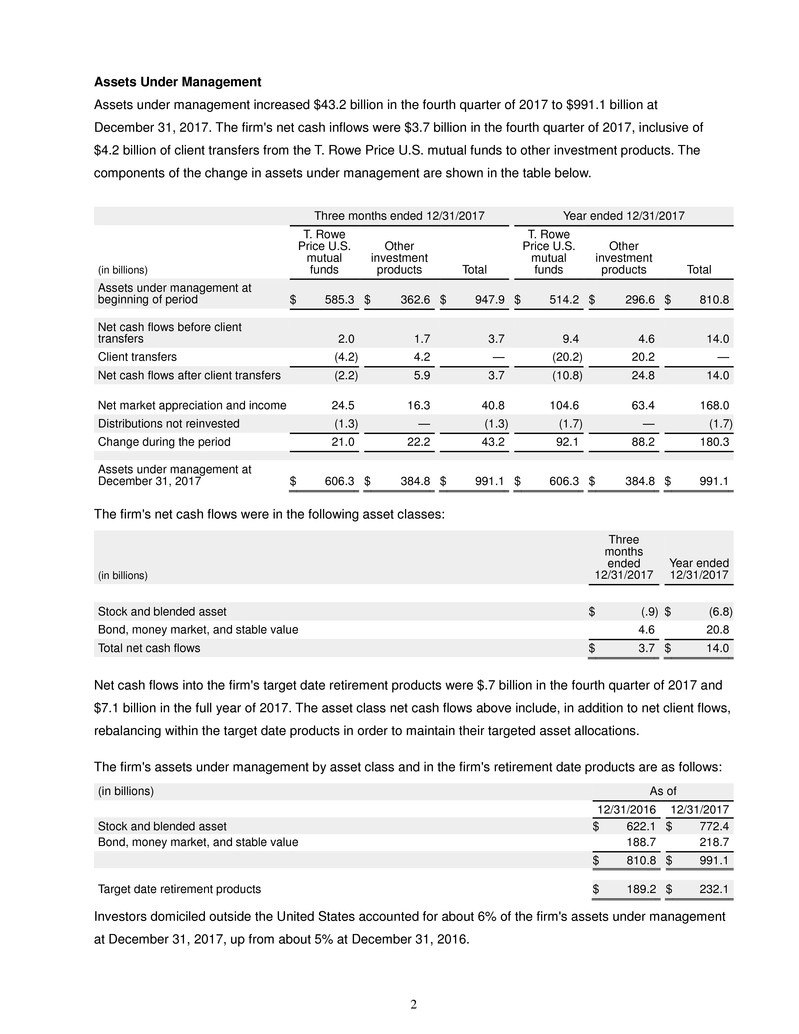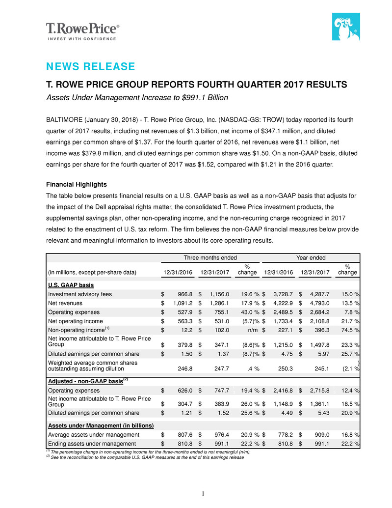 T. ROWE PRICE GROUP REPORTS FOURTH QUARTER 2017 RESULTS