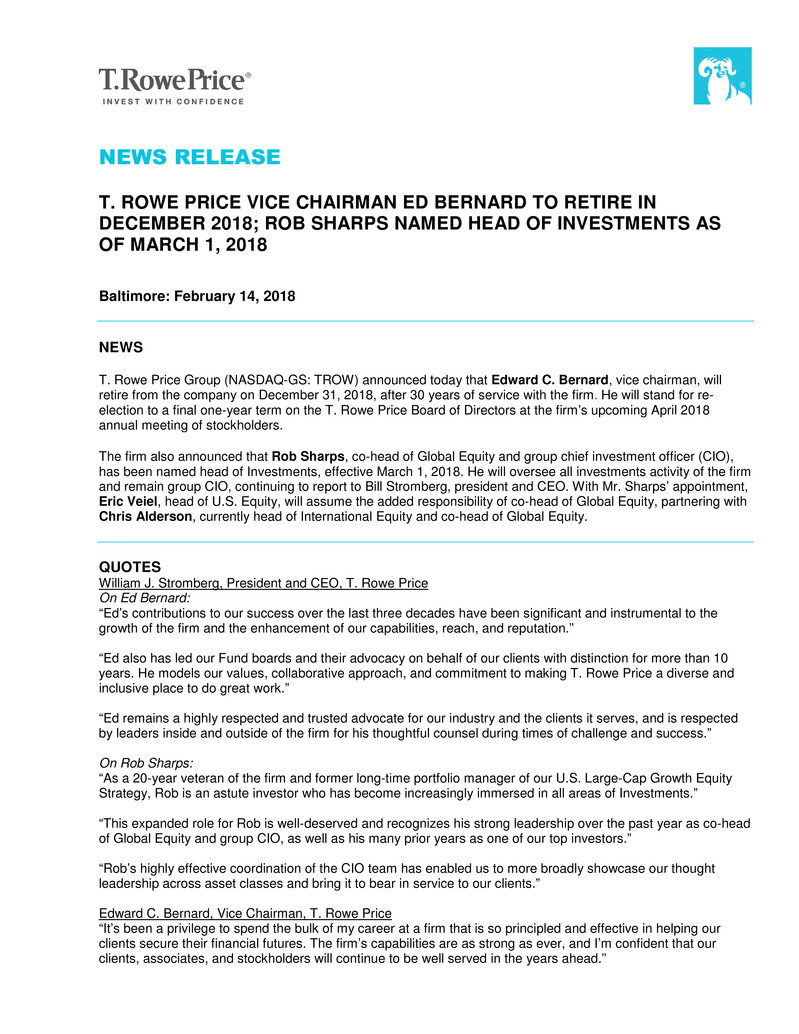 T. ROWE PRICE VICE CHAIRMAN ED BERNARD TO RETIRE IN