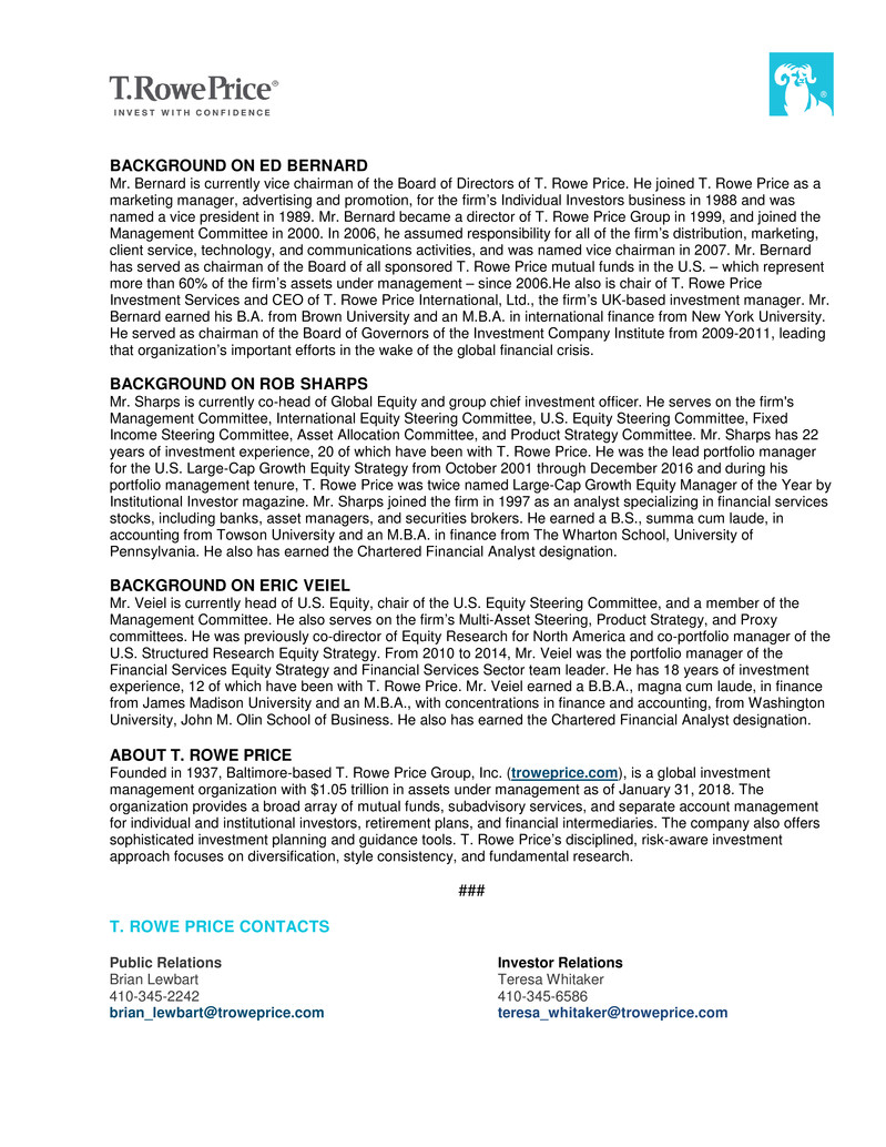 election to a final one-year term on the T. Rowe Price Board of Directors at the firm’s upcoming April 2018